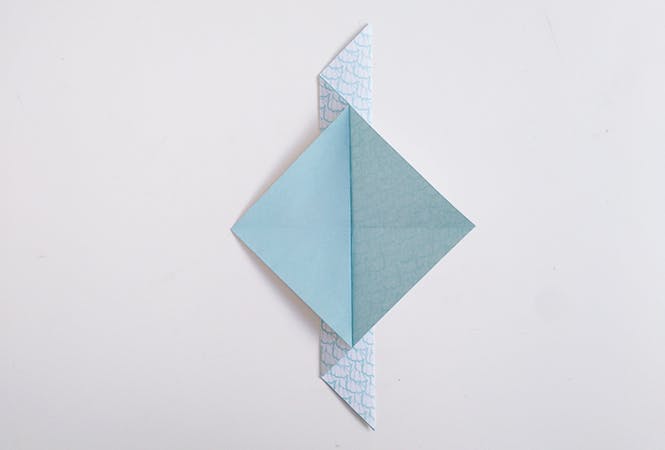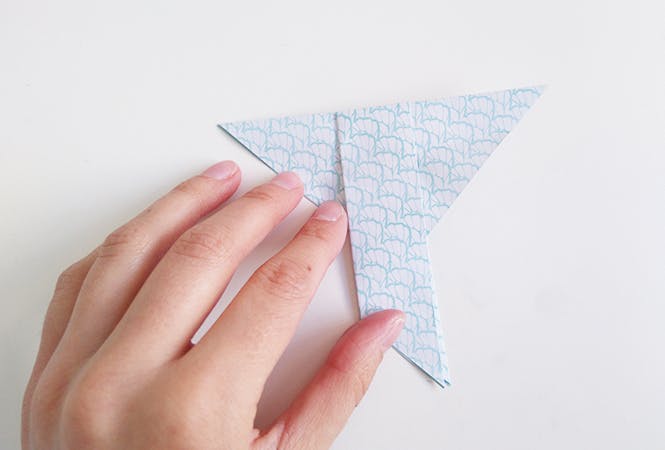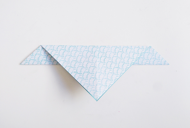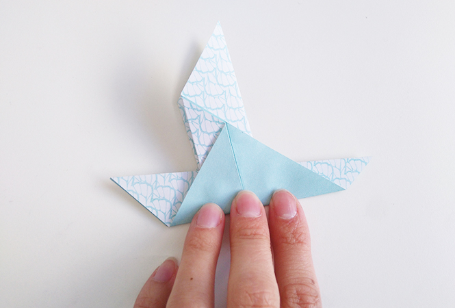 Ouvrez la partie supérieure en repliant vers le haut pour former les ailes de l'oiseau, le pli est légèrement de travers comme ceci :